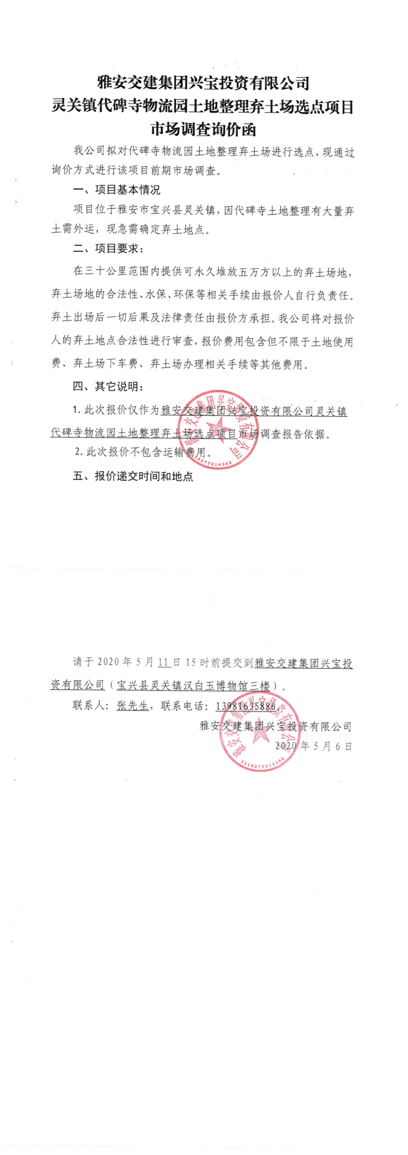 DB视讯 集团兴宝投资有限公司灵关镇代碑寺物流园土地整理弃土场选点项目市场调查询价函