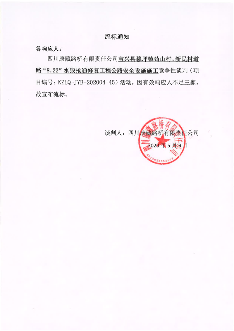 四川康藏路桥有限责任公司宝兴县穆坪镇苟山村、新民村道路“8.22”水毁抢通修复工程公路安全设施施工竞争性谈判流标通知