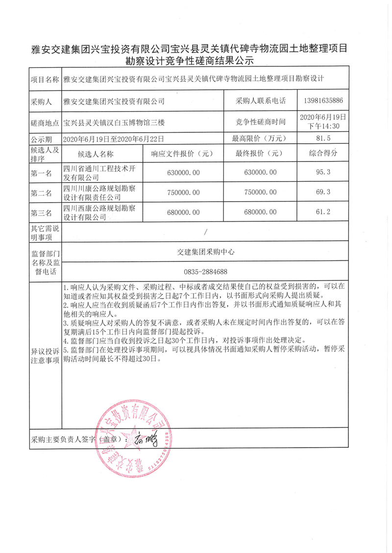 DB视讯 集团兴宝投资有限公司宝兴县灵关镇代碑寺物流园土地整理项目勘察设计竞争性磋商结果公示