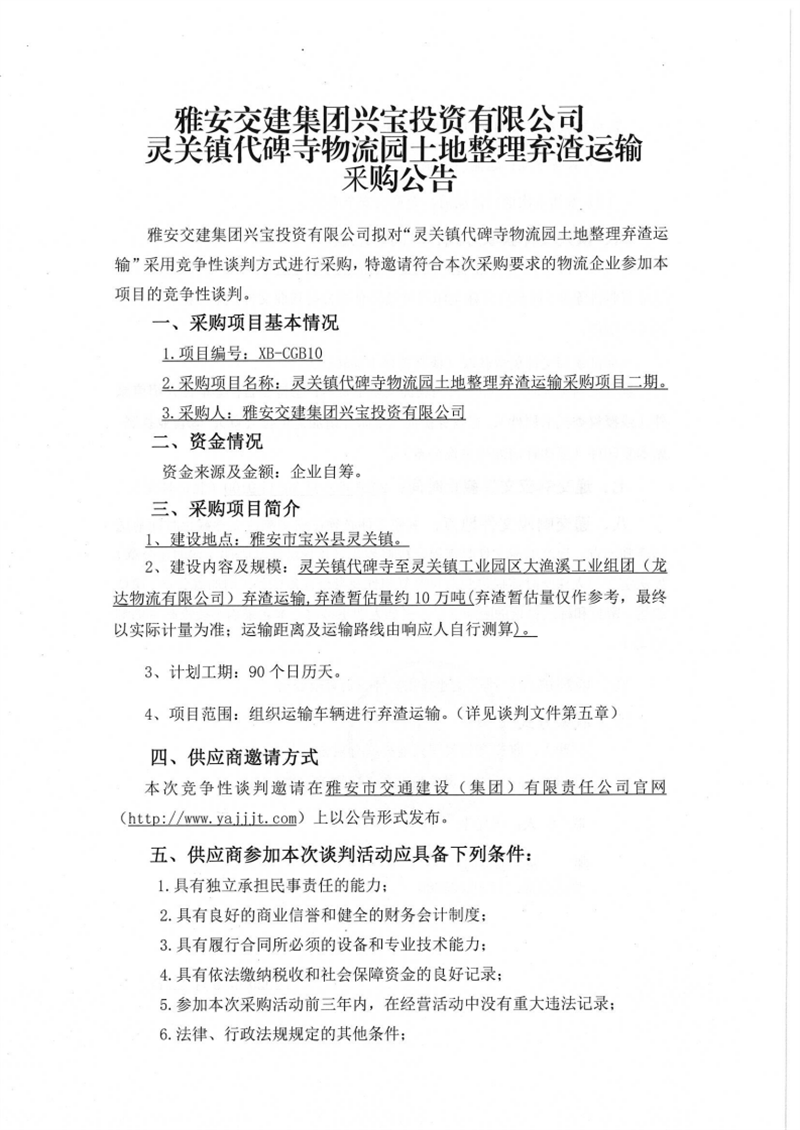 DB视讯 集团兴宝投资有限公司灵关镇代碑寺物流园土地整理弃渣运输采购项目二期竞争性谈判公告