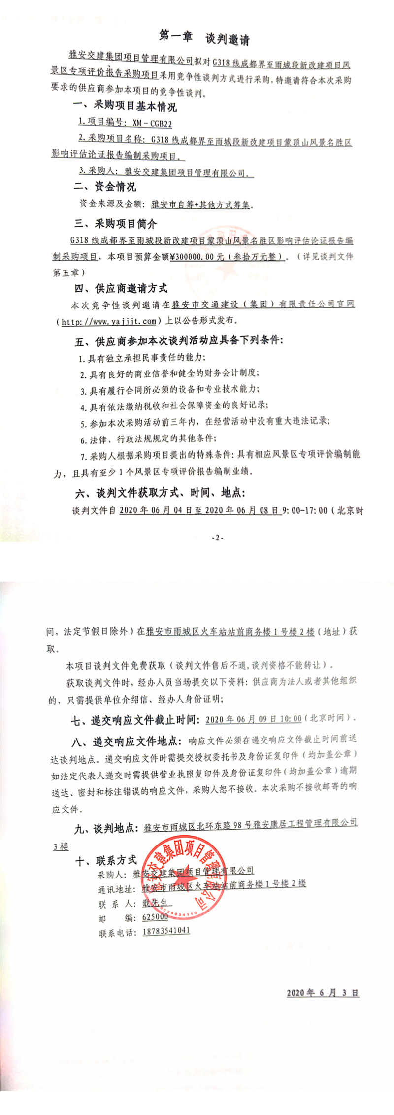 DB视讯 集团项目管理有限公司G318线成都界至雨城段新改建项目蒙顶山风景名胜区影响评估论证报告编制采购项目竞争性谈判公告