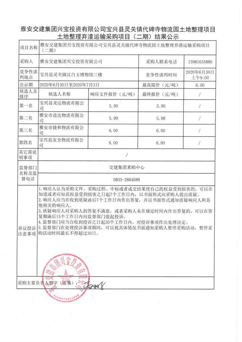 DB视讯 集团兴宝投资有限公司宝兴县灵关镇代碑寺物流园土地整理项目土地整理弃渣运输采购项目(二期)结果公示