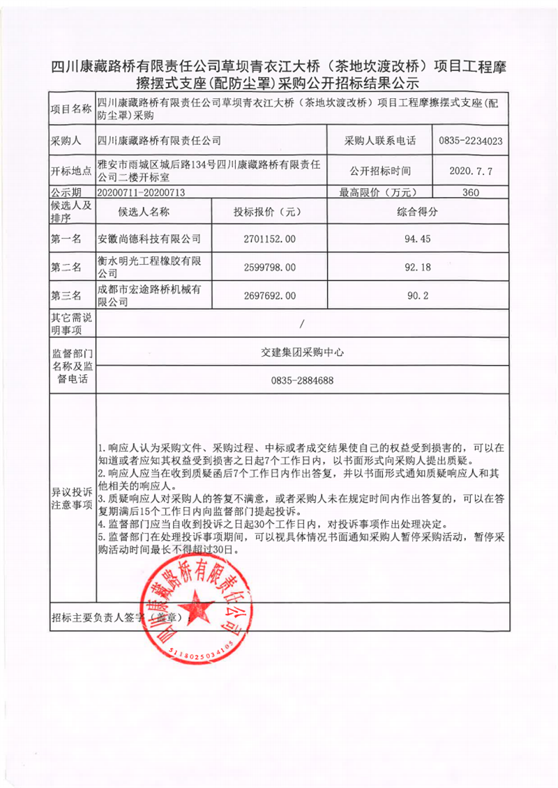 四川康藏路桥有限责任公司草坝青衣江大桥(茶地坎渡改桥)项目工程摩擦摆式支座(配防尘罩)采购公开招标结果公示