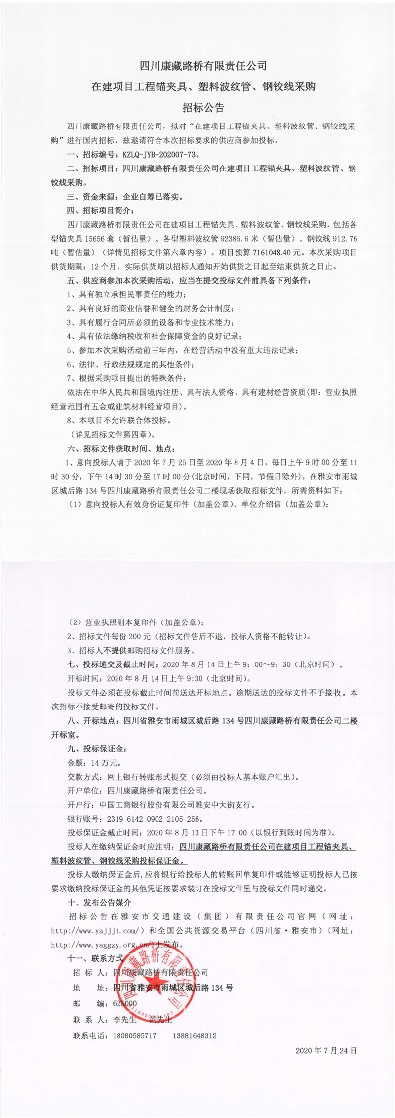 四川康藏路桥有限责任公司在建项目工程锚夹具、塑料波纹管、钢铰线采购招标公告