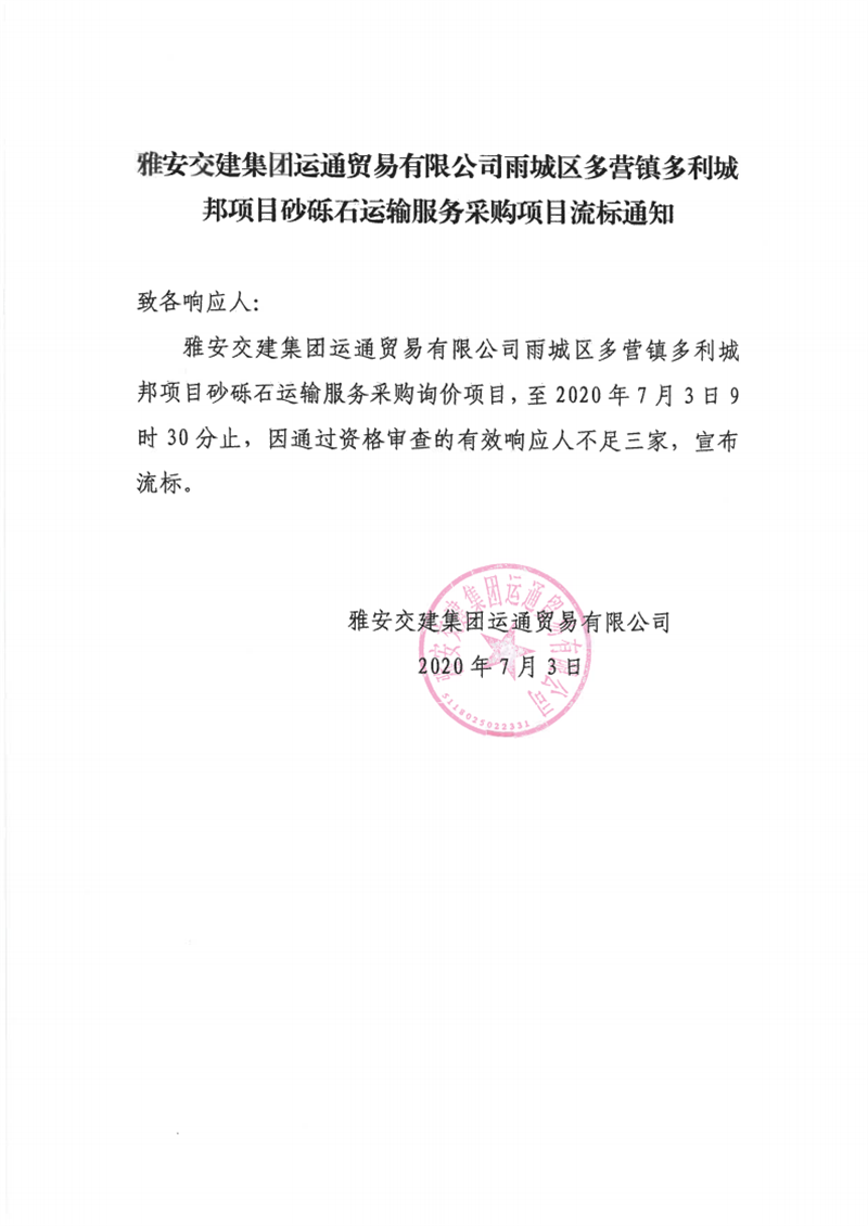 DB视讯 集团运通贸易有限公司雨城区多营镇多利城邦项目砂砾石运输服务采购项目流标通知