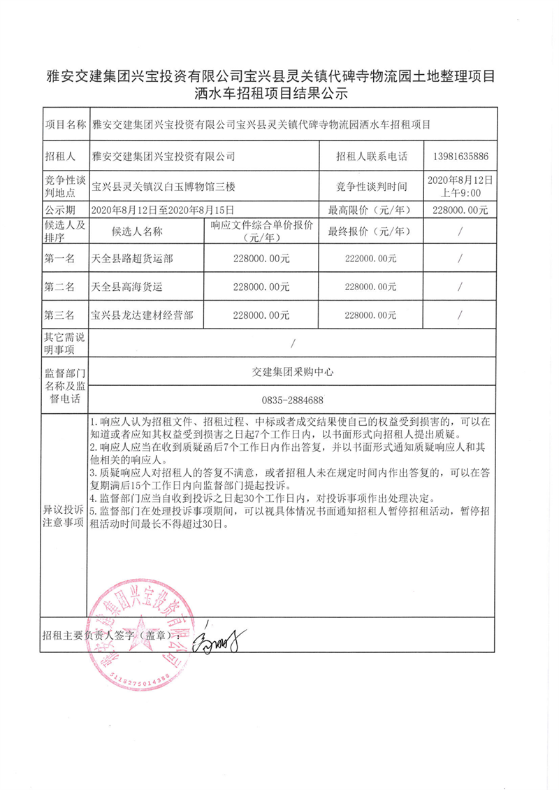 DB视讯 集团兴宝投资有限公司宝兴县灵关镇代碑寺物流园洒水车招租项目结果公示