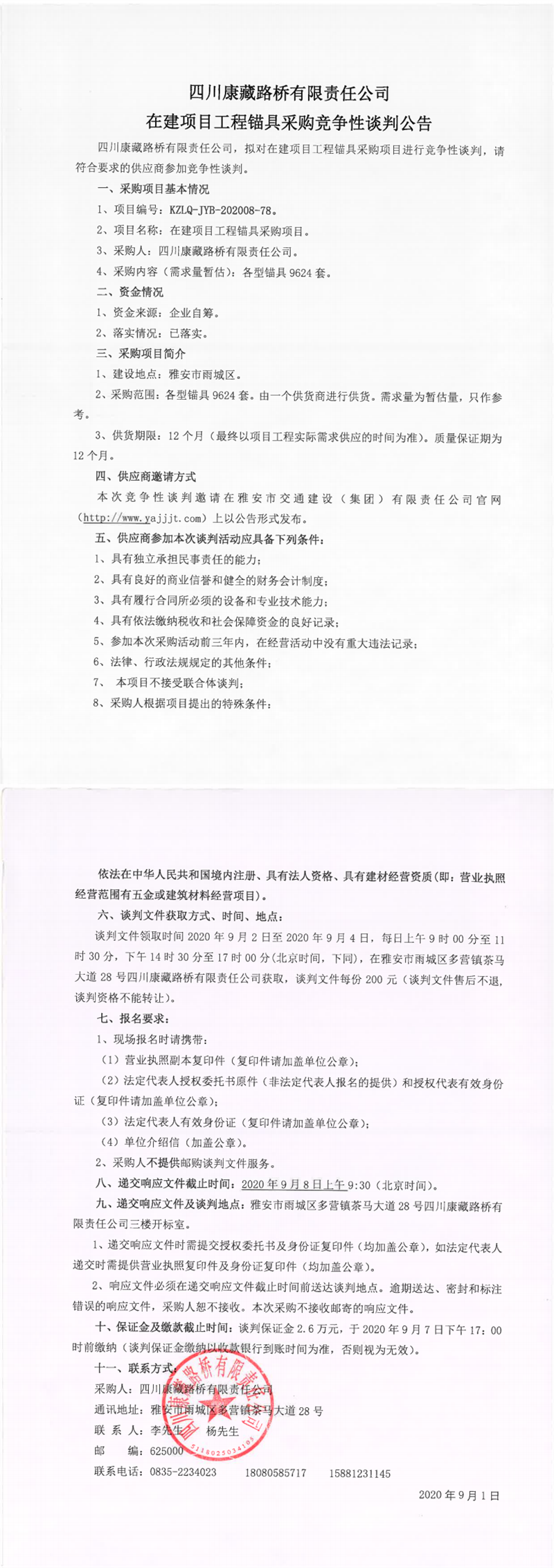 四川康藏路桥有限责任公司在建项目工程锚具采购竞争性谈判公告
