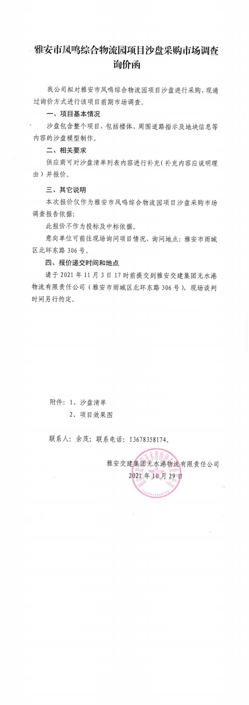 DB视讯 集团无水港物流有限责任公司雅安市凤鸣综合物流园项目沙盘采购市场调查询价函