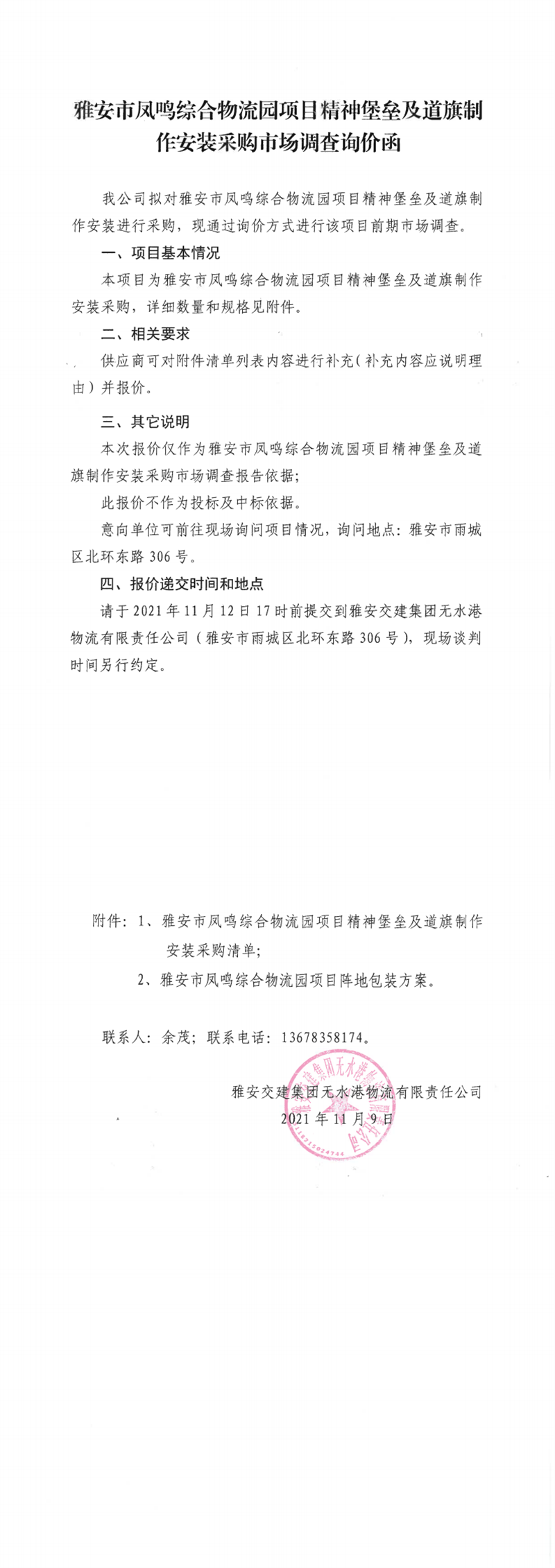 DB视讯 集团无水港物流有限责任公司雅安市凤鸣综合物流园项目精神堡垒及道旗制作安装采购市场调查询价函