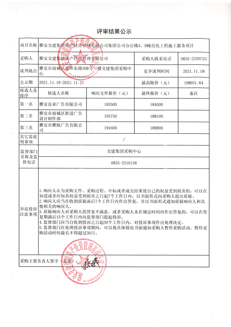DB视讯 集团资产经营管理有限公司集团公司办公楼A、B幢亮化工程施工服务项目评审结果公示