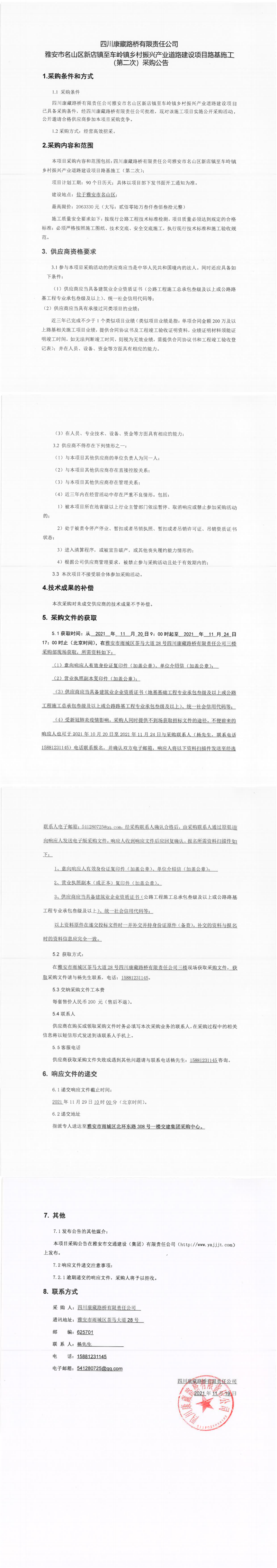 四川康藏路桥有限责任公司雅安市名山区新店镇至车岭镇乡村振兴产业道路建设项目路基施工(第二次)采购公告