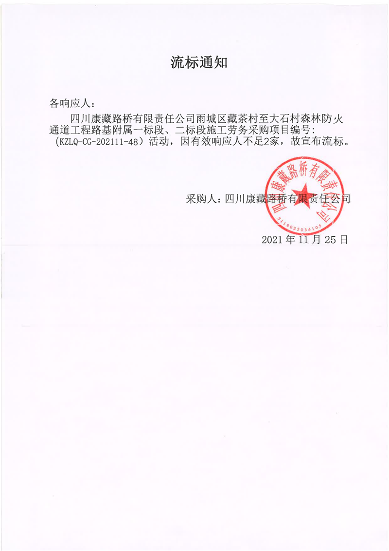 四川康藏路桥有限责任公司雨城区藏茶村至大石村森林防火通道工程路基附属一标段、二标段施工劳务流标通知