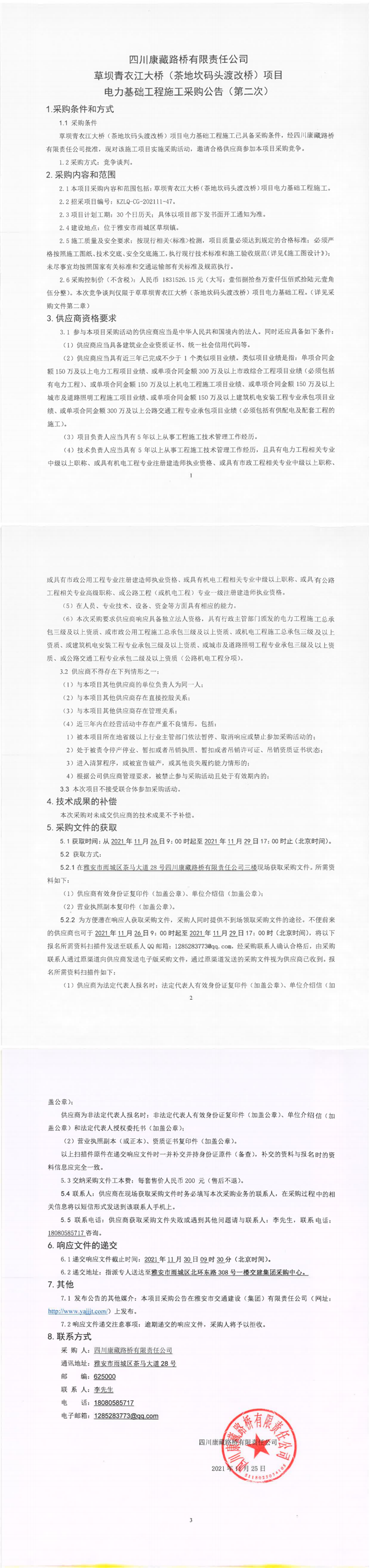 四川康藏路桥有限责任公司草坝青衣江大桥(茶地坎码头渡改桥)项目电力基础工程施工采购公告(第二次)