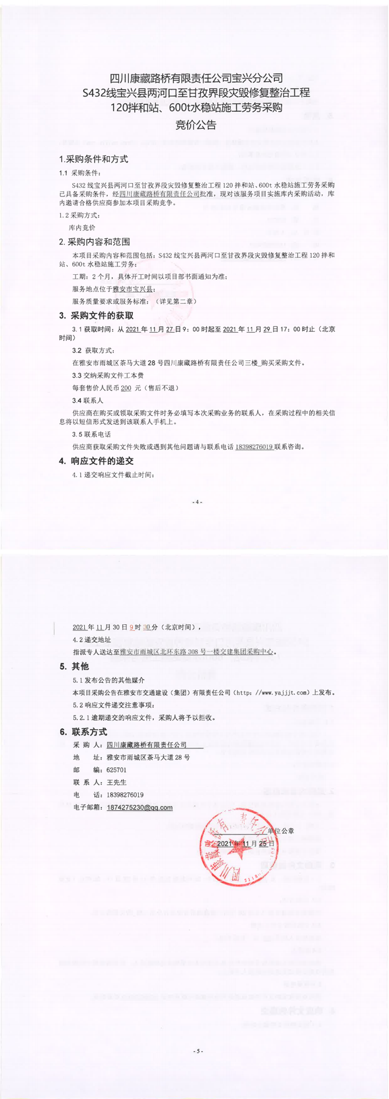 四川康藏路桥有限责任公司S432线宝兴县两河口至甘孜界段灾毁修复整治工程120拌合站、600t水稳站施工劳务采购竞价公告