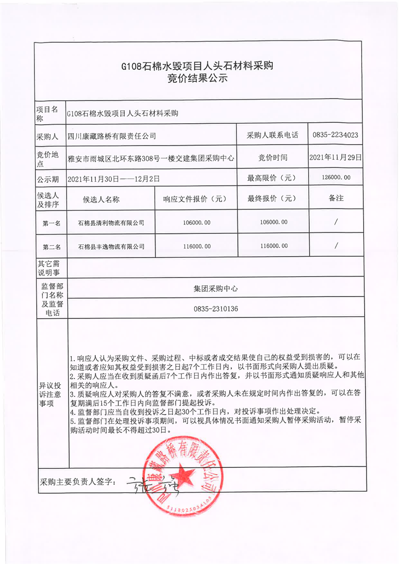 四川康藏路桥有限责任公司G108石棉水毁项目人头石材料采购竞价结果公示