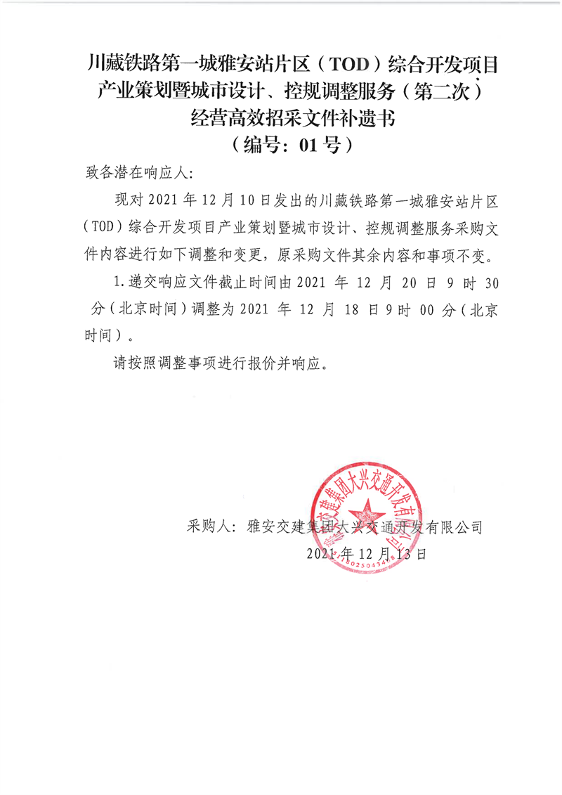 DB视讯 集团大兴交通开发有限公司川藏铁路第一城雅安站片区(TOD)综合开发项目产业策划暨城市设计、控规调整服务(第二次)经营高效招采文件补遗书(编号:01号)