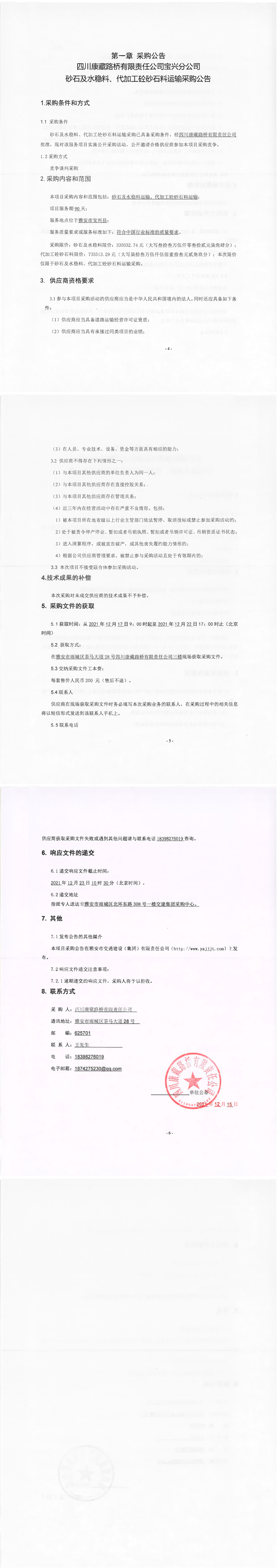 四川康藏路桥有限责任公司宝兴分公司砂石及水稳料、代加工砼砂石料运输采购公告