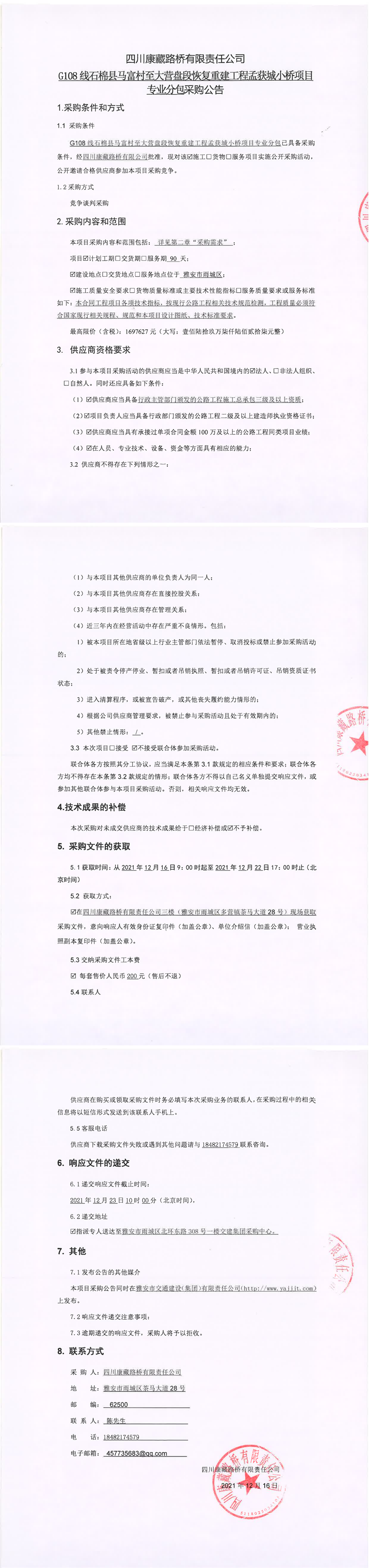 四川康藏路桥有限责任公司G108线石棉县马富村至大营盘段恢复重建工程孟获城小桥项目专业分包采购公告
