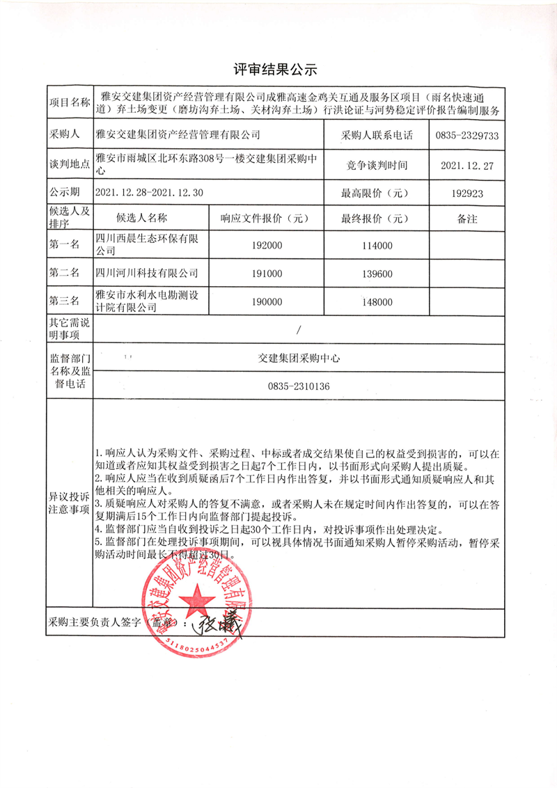 DB视讯 集团资产经营管理有限公司成雅高速金鸡关互通及服务区项目(雨名快速通道)弃土场变更(磨坊沟弃土场、关材沟弃土场)行洪论证与河势稳定评价报告编制服务评审结果公示