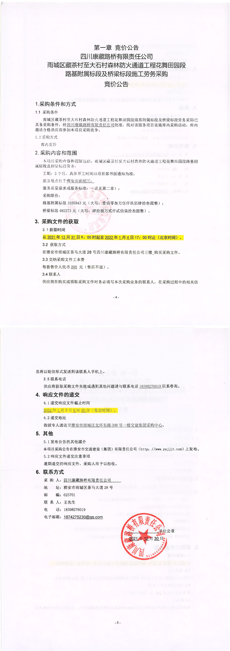 四川康藏路桥有限责任公司雨城区藏茶村至大石村森林防火通道工程花舞田园段路基附属标段及桥梁标段施工劳务采购竞价公告