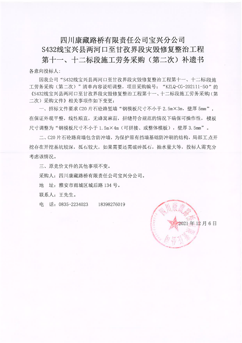 四川康藏路桥有限责任公司S432线宝兴县两河口至甘孜界段灾毁修复整治工程第十一、十二标段施工劳务采购(第二次)补遗书