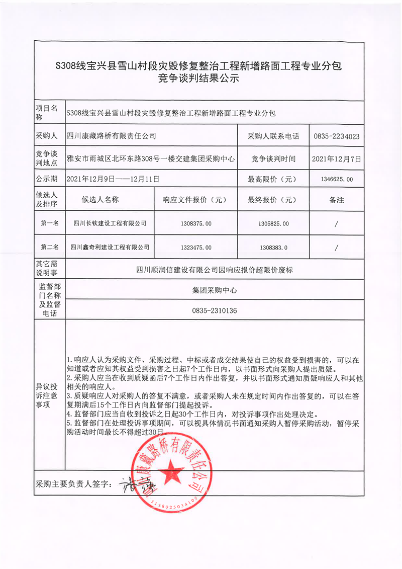 四川康藏路桥有限责任公司S308线宝兴县雪山村段灾毁修复整治工程新增路面工程专业分包竞争谈判结果公示