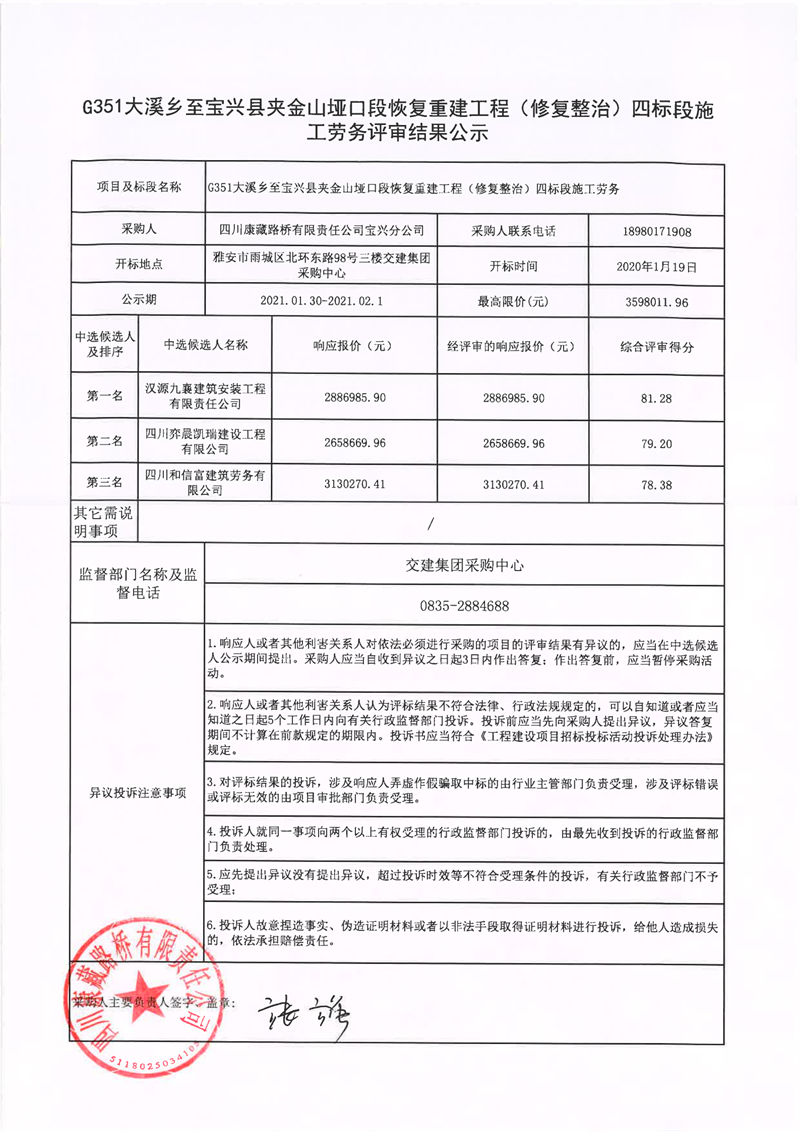 四川康藏路桥有限责任公司G351大溪乡至宝兴县夹金山垭口段恢复重建工程(修复整治)四标段施工劳务评审结果公示