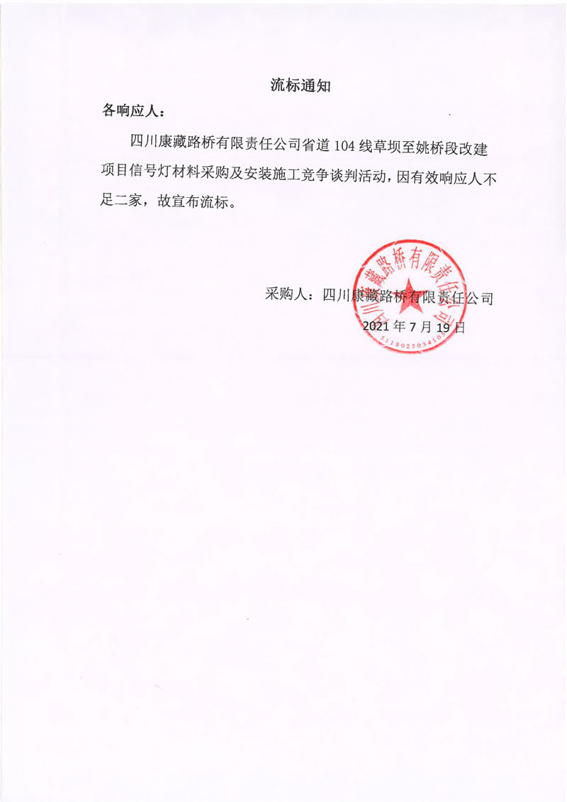 四川康藏路桥有限责任公司省道104线草坝至姚桥段改建项目信号灯材料采购及安装施工竞争谈判流标通知