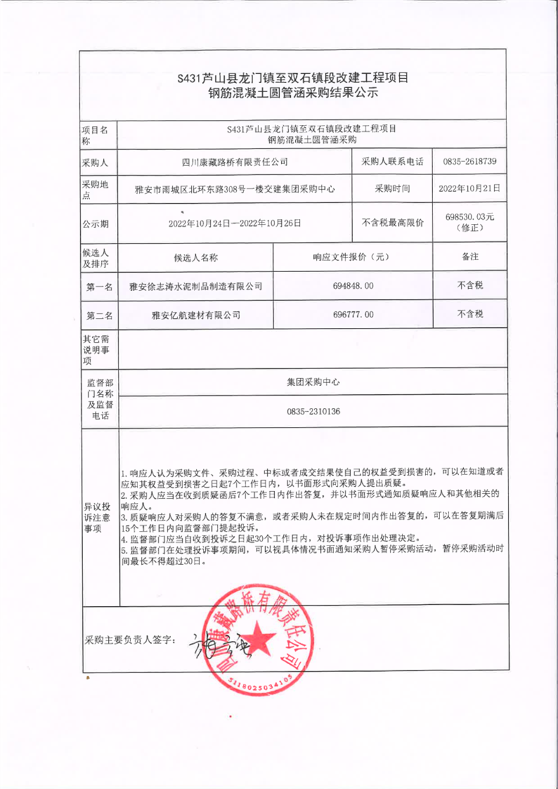 四川康藏路桥有限责任公司S431芦山县龙门镇至双石镇段改建工程项目钢筋混凝土圆管涵采购结果公示