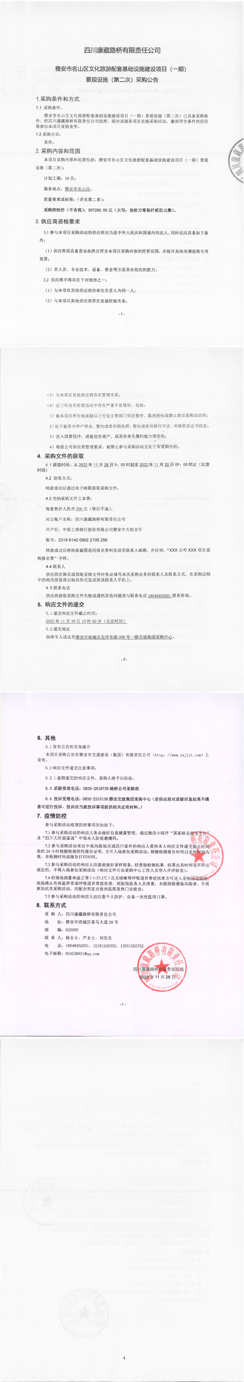 四川康藏路桥有限责任公司雅安市名山区文化旅游配套基础设施建设项目(一期)景观设施(第二次)采购公告