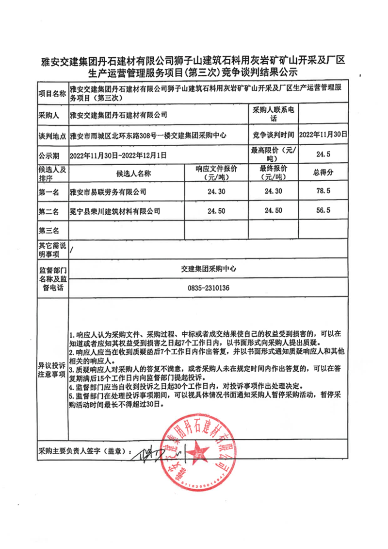 DB视讯 集团丹石建材有限公司狮子山建筑石料用灰岩矿矿山开采及厂区生产运营管理服务项目(第三次)竞争谈判结果公示