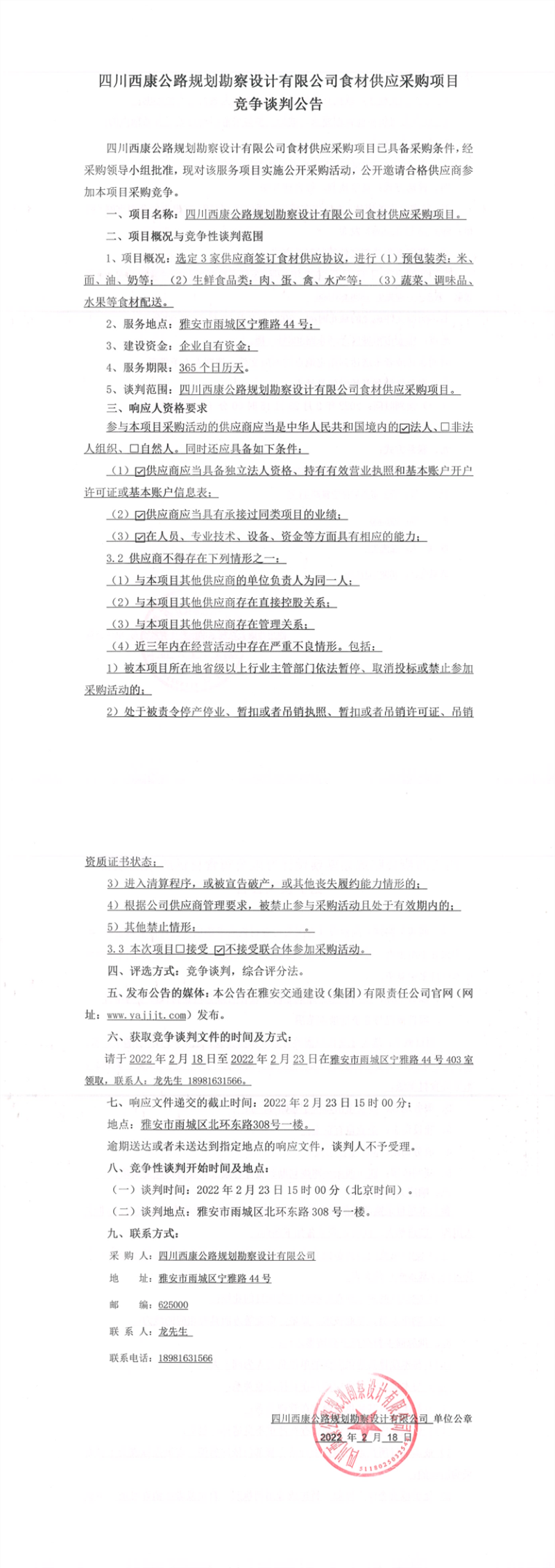 四川西康公路规划勘察设计有限公司食材供应采购项目竞争谈判公告