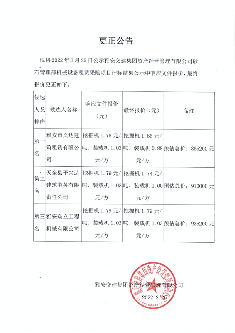 DB视讯 集团资产经营管理有限公司砂石管理部机械设备租赁采购项目评标结果公示更正公告