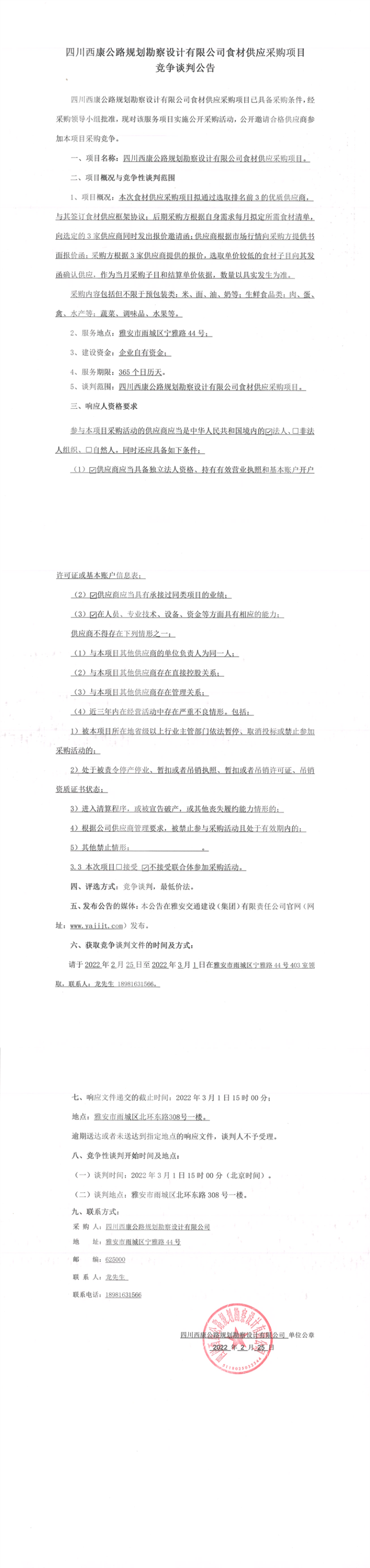 四川西康公路规划勘察设计有限公司食材供应采购项目竞争谈判公告