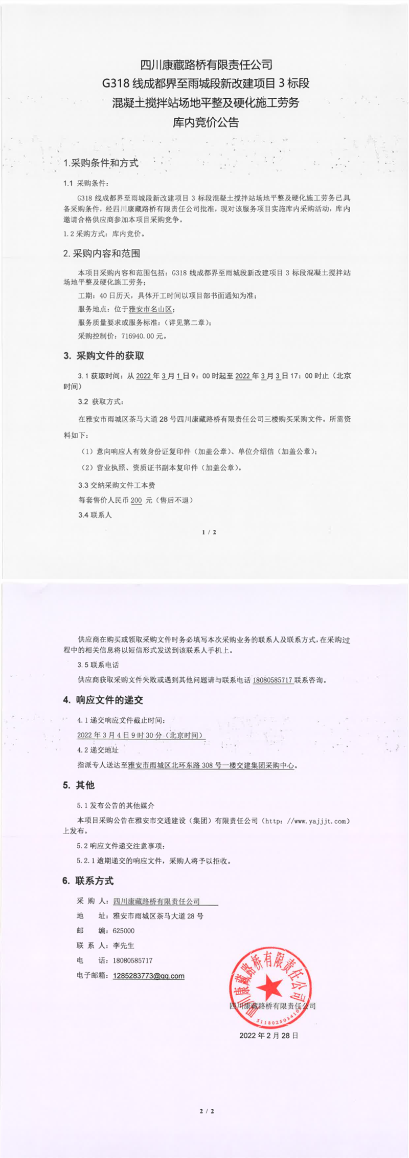 四川康藏路桥有限责任公司G318线成都界至雨城段新改建项目3标段混凝土搅拌站场地平整及硬化施工劳务库内竞价公告