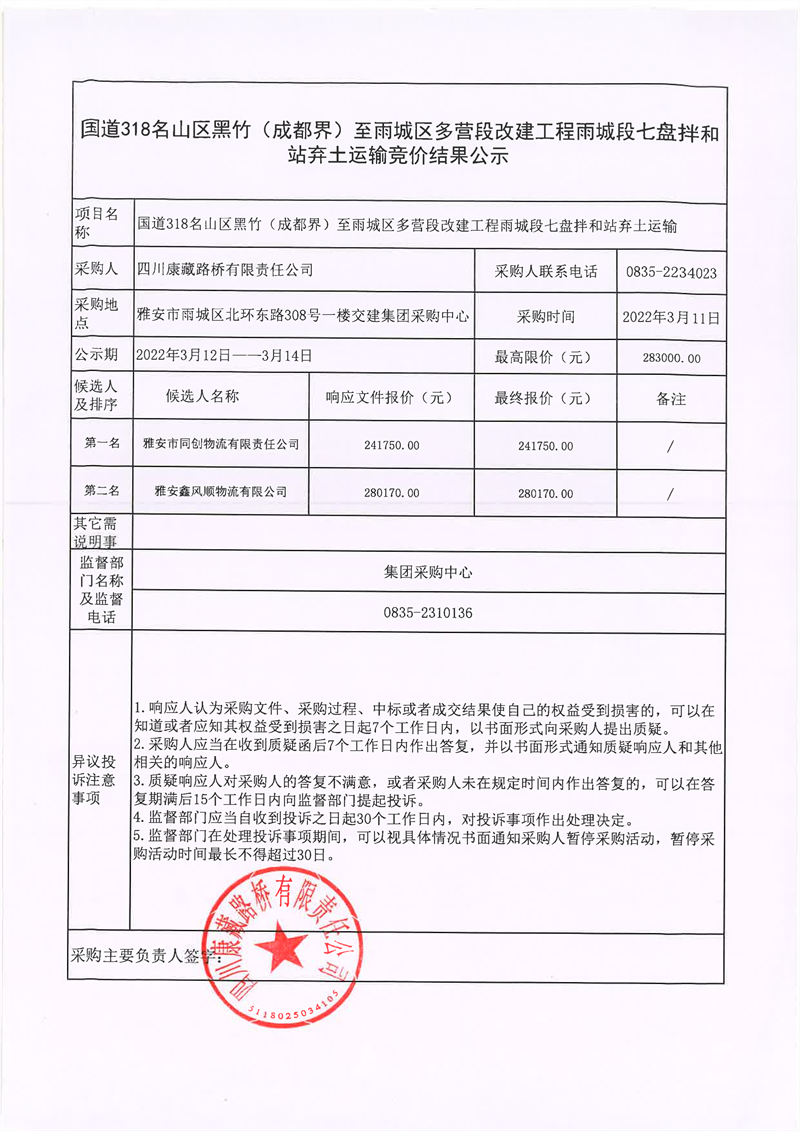 四川康藏路桥有限责任公司国道318名山区黑竹(成都界)至雨城区多营段改建工程雨城段七盘拌和站弃土运输竞价结果公示