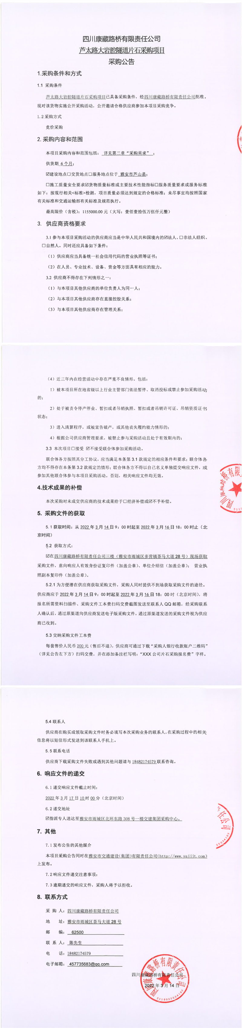 四川康藏路桥有限责任公司芦太路大岩腔隧道片石采购项目采购公告