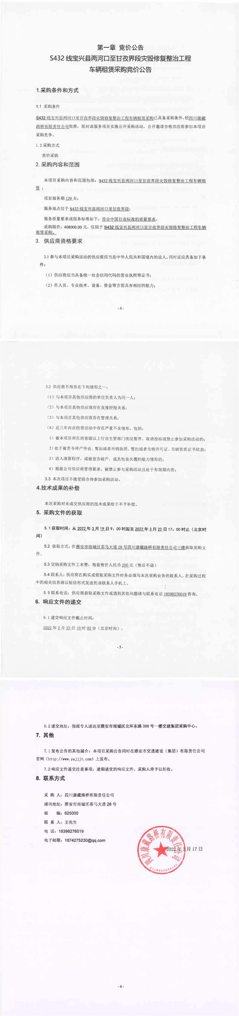 四川康藏路桥有限责任公司S432线宝兴县两河口至甘孜界段灾毁修复整治工程车辆租赁采购竞价公告
