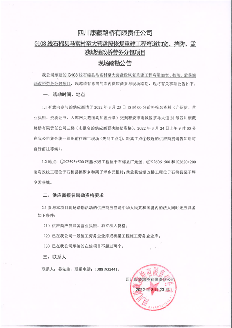 四川康藏路桥有限责任公司G108线石棉县马富村至大营盘段恢复重建工程弯道加宽、挡防、孟获城涵改桥劳务分包项目现场踏勘公告