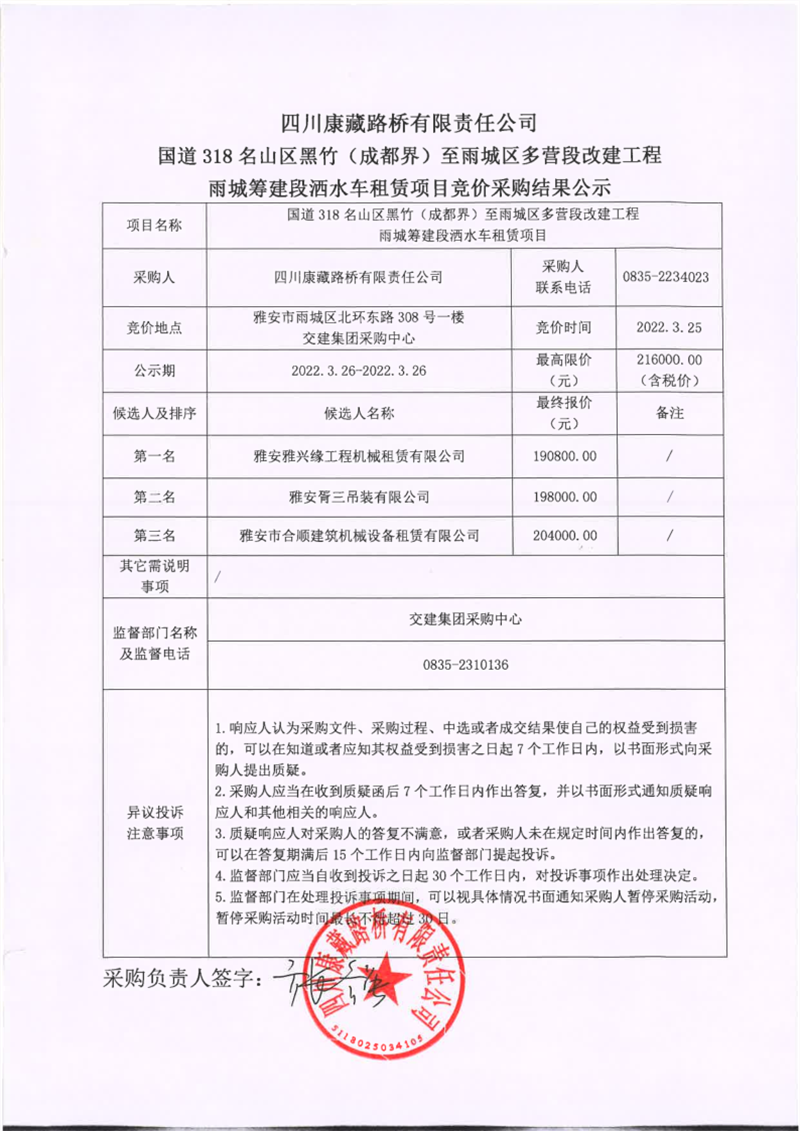 四川康藏路桥有限责任公司国道318名山区黑竹(成都界)至雨城区多营段改建工程雨城筹建段洒水车租赁项目竞价采购结果公示