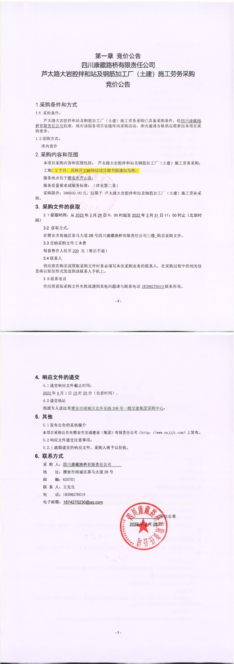 四川康藏路桥有限责任公司芦太路大岩腔拌和站及钢筋加工厂(土建)施工劳务采购竞价公告