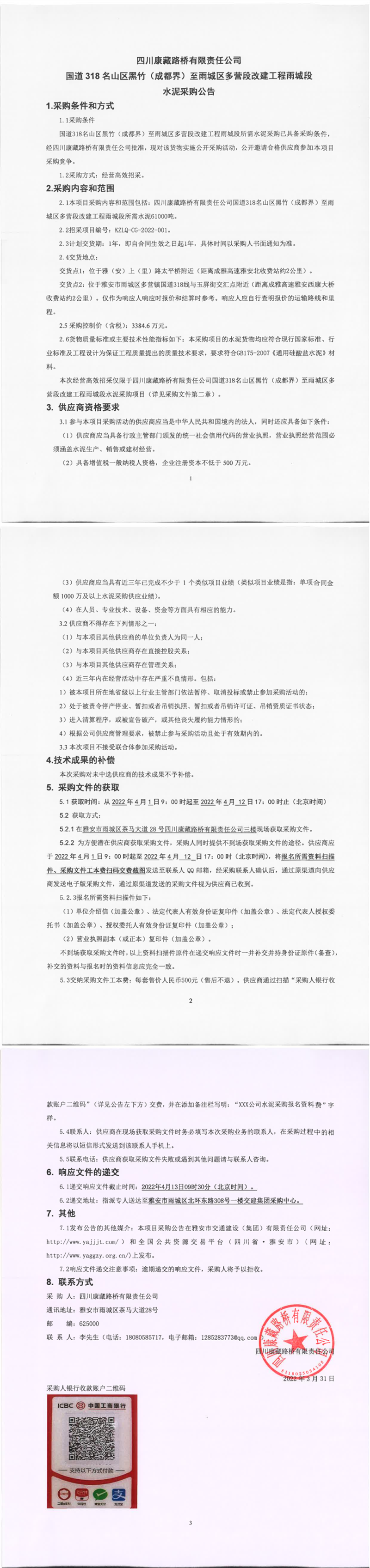 四川康藏路桥有限责任公司国道318名山区黑竹(成都界)至雨城区多营段改建工程雨城段水泥采购公告
