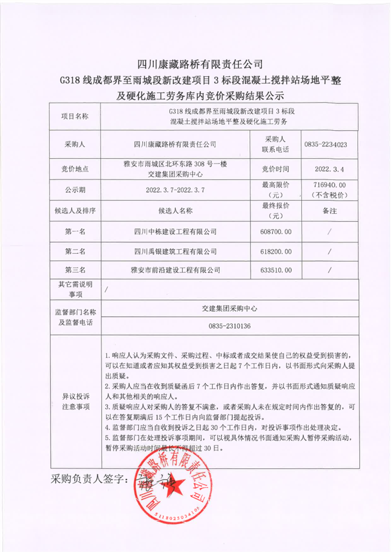 四川康藏路桥有限责任公司G318线成都界至雨城段新改建项目3标段混凝土搅拌站场地平整及硬化施工劳务库内竞价采购结果公示