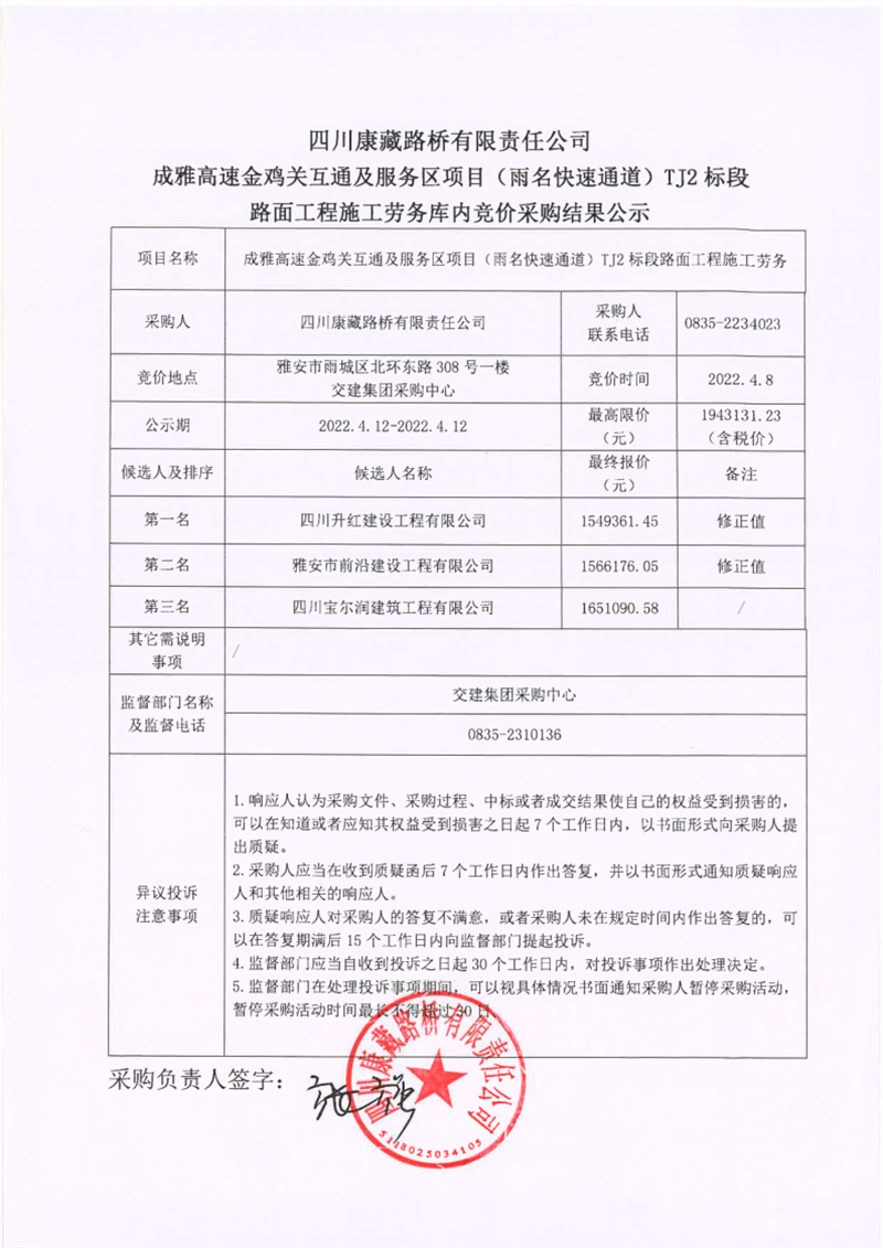 四川康藏路桥有限责任公司成雅高速金鸡关互通及服务区项目(雨名快速通道)TJ2标段路面工程施工劳务库内竞价采购结果公示
