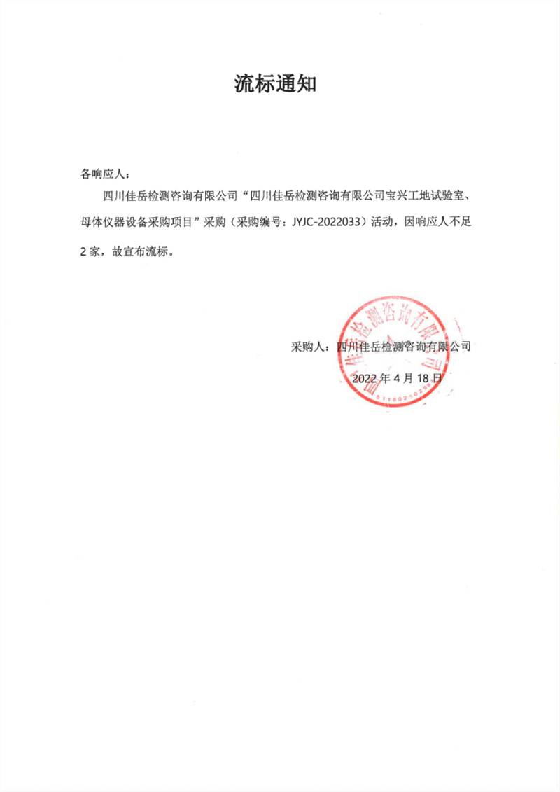 四川佳岳检测咨询有限公司宝兴工地试验室、母体仪器设备采购项目流标通知