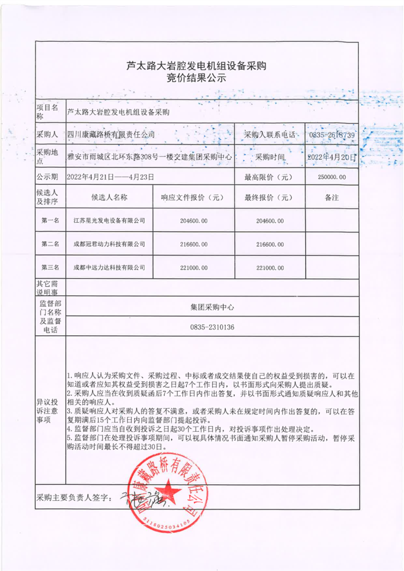 四川康藏路桥有限责任公司芦太路大岩腔发电机组设备采购竞价结果公示