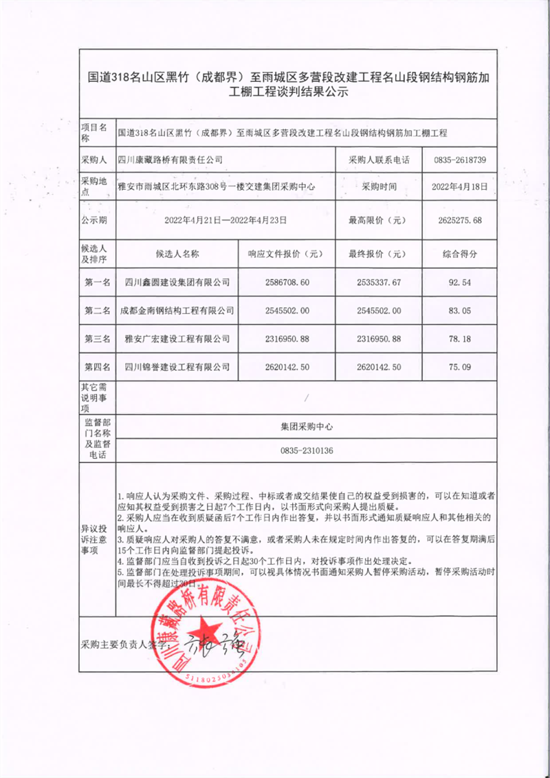 四川康藏路桥有限责任公司国道318名山区黑竹(成都界)至雨城区多营段改建工程名山段钢结构钢筋加工棚工程谈判结果公示