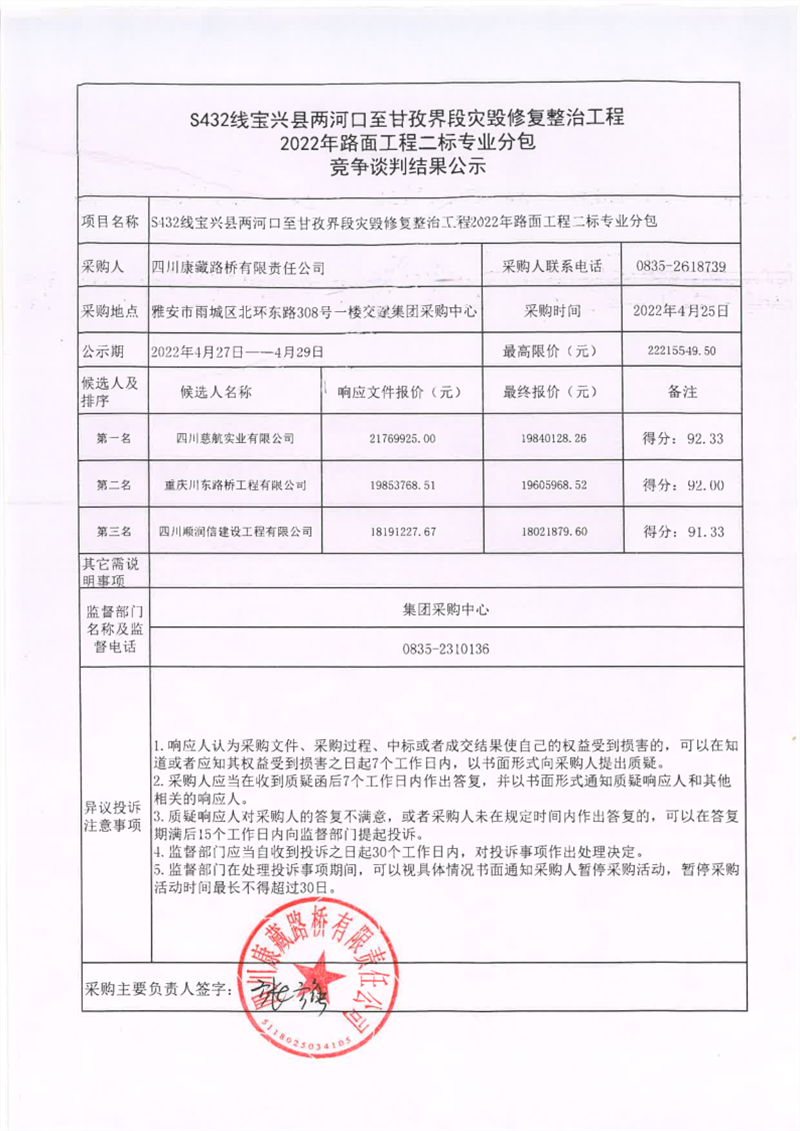 四川康藏路桥有限责任公司S432线宝兴县两河口至甘孜界段灾毁修复整治工程2022年路面工程二标专业分包竞争谈判结果公示