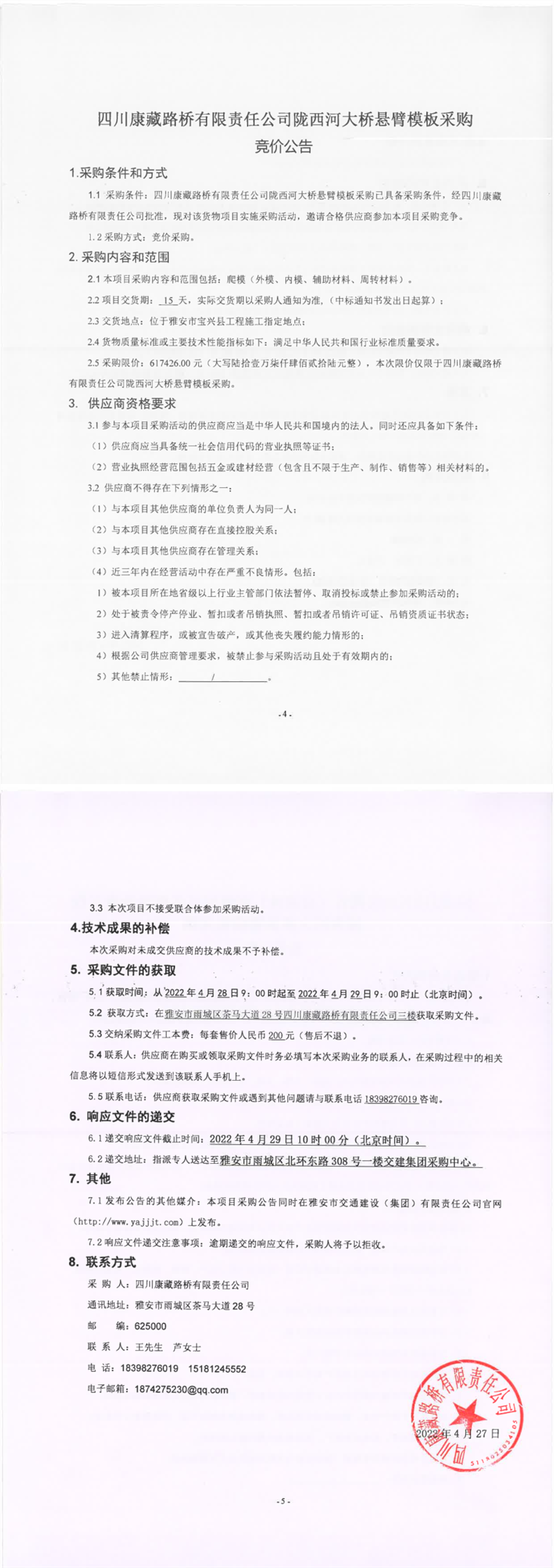 四川康藏路桥有限责任公司陇西河大桥悬臂模板采购竞价公告