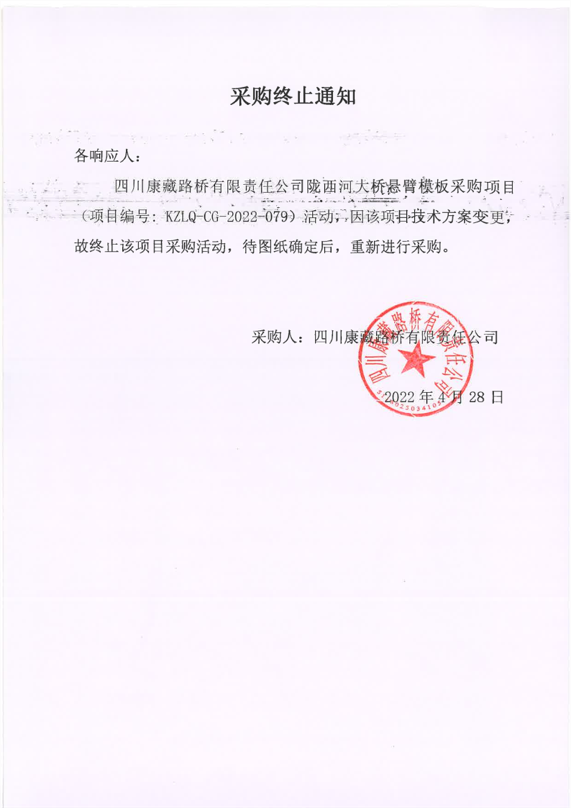 四川康藏路桥有限责任公司陇西河大桥悬臂模板采购终止通知